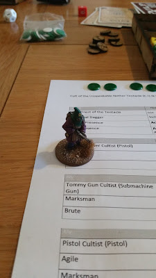 The Cult league consisted of the The High Priest of the Tentacle (Leader), three cultists (Allies with a flamethrower, Tommy Gun and Pistol each and one cultist (Follower) who was unarmed (apart from a cigar). This league had the Companions, Dominion and Dark Pact perks. Joey rolled well with his High Priest's cunning and got four points to spend with Dark Pact. He opted to give his High Priest the Winged ability, the Flamethrower Cultist; Shadow step and Aura of Night to the Tommy Gun Cultist.